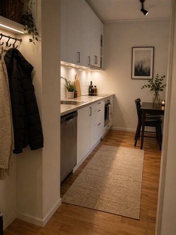 En nyproducerad tvårumslägenhet erbjuds till uthyrning i ett eftertraktat område, där modern standard och stilfulla materialval står i fokus. Denna bostad präglas av ljusa ytor och en genomtänkt planlösning som skapar ett harmoniskt boende med en hög kvalitetskänsla.Vid inträdet möts du av en rymlig och öppen hall som leder in till ett sammanhängande utrymme med slitstarkt klinkergolv som övergår i vackert ekparkettgolv från Kährs. Väggarna är målade i en mild grå nyans som ger hela lägenheten ett stilfullt och rogivande intryck. Köket, som är från Marbodal, är modernt utrustat med bland annat diskmaskin, kyl och frys samt en ugn och spishäll med keramisk yta - en lösning som passar både vardagliga måltider och sociala tillfällen. Badrummet är helt kaklat och utrustat med klinkergolv, dusch med glasväggar samt handdukstork. Det finns även en egen tvättmöjlighet i lägenheten, vilket ökar bekvämligheten för den boende. Förvaring sker inom själva lägenheten, då det inte finns något externt förråd.